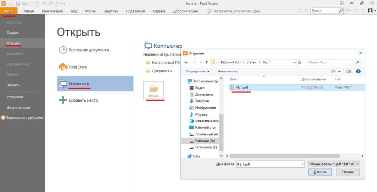 - Открытие и просмотр файлов PDF