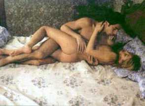 Женщина лежит на спине, слегка наклонившись на бок, её правое бедро располагается между ног мужчины. Мужчина сверху под небольшим углом к ней поддерживает себя на правом локте, правое бедро между женских ног.