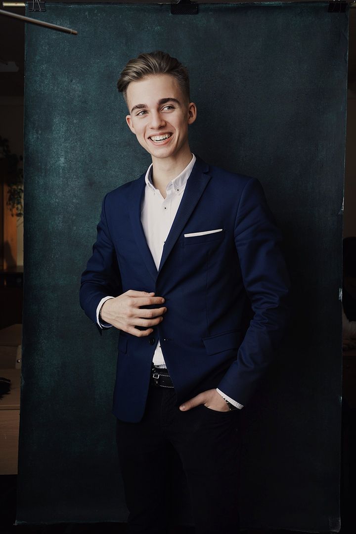 Мужские позы для выпускного альбома отличаются от женских большим количеством прямых углов. Юноши предпочитают, чтобы на фотографиях плечи казались более широкими и мускулистыми, а бедра наоборот, узкими. Добиться такого эффекта получится, если став прямо перед объективом, верхнюю часть туловища выровнять и немного выдвинуть вперед, а бедра развернуть от камеры.