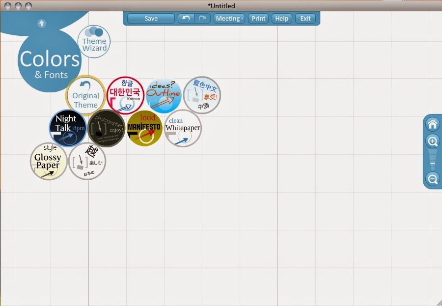 Еще один полезный шаг перед началом работы над презентацией — сориентироваться в различных пунктах меню. В левом углу вы найдете несколько параметров и параметров инструментов: «Запись» (инструмент по умолчанию), «Рамка», «Контур», «Вставка и фигуры», «Показать» и «Цвета и шрифты». Меню верхней панели позволяет пользователям сохранять по мере необходимости, отменять или повторять действие, распечатывать, выходить, обращаться за помощью, а также облегчает совместные усилия с помощью функций «Встречи». Кнопки в правой части экрана позволяют пользователям увеличивать и уменьшать масштаб, а также возвращаться «домой» (что обеспечивает снимок всего холста с помощью длиннофокусного объектива).