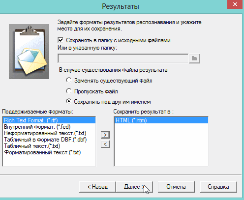 Полученный результат можно сохранить в любом из форматов: PDF, HTML, XML, DOC, RTF, XLS, PPT, DBF, CSV или TXT. Изображения можно сохранить в формате bmp, tiff, jpeg, jpeg2000, png. При сохранении в pdf и djvu можно выполнить автоматическое выравнивание, автоматическое разделение сдвоенных страниц, а встроенным графическим редактором можно не только удалить нежелательные элементы, но и произвести цветовую и яркостную коррекцию.