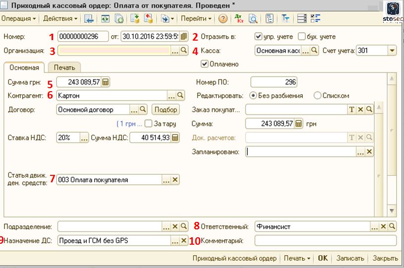 - Данные о количестве товаров, зарегистрированные в сопроводительном документе, переносятся в документ Приходный ордер на товары.