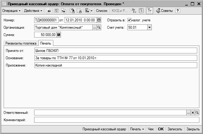- если количество товара соответствует сопроводительному документу, то в ордере устанавливается статус Принято и документ проводится;