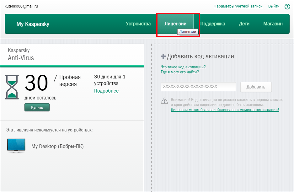 Если вы когда-нибудь потеряете свой код активации, вы можете использовать лицензионный ключ, также известный как ключ Касперского, для восстановления вашей лицензии.