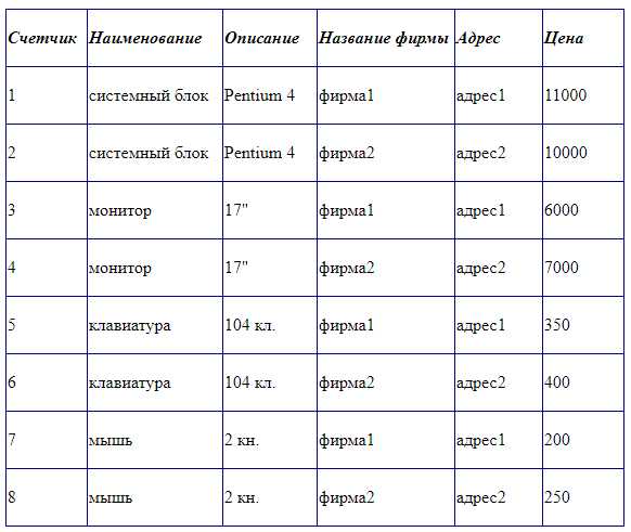Связанные между собой таблицы являются единой базой данных, в которой возможно создание новых таблиц, а также запросов и отчетов. Заполнять базу данных можно с помощью формы. Рассмотрим это на примере. Допустим в табличной базе данных «Комплектующие компьютера и поставщики» содержится информация о различных комплектующих, кроме того, она имеет поля Счетчик, Наименование, Описание, Название фирмы, Адрес, Цена (в рублях) — табл. 1.