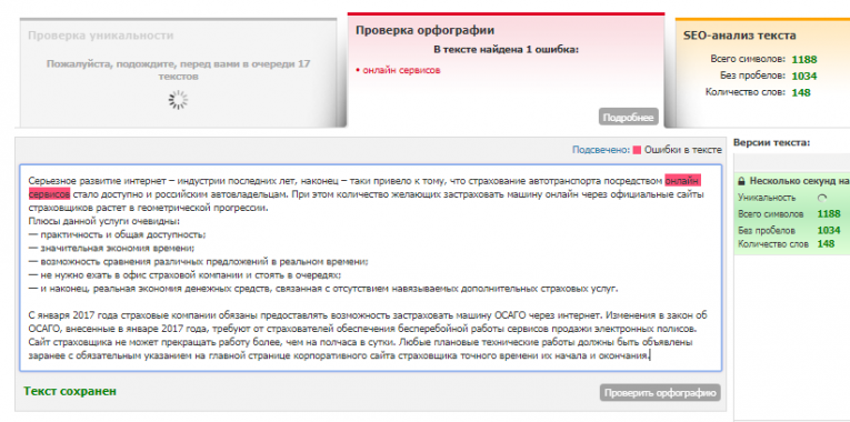 Платный инструмент, с помощью которого можно проанализировать до 1млн знаков в месяц. В результате одной проверки показываются найденные ошибки, тавтологии, иностранные слова и рассчитывается уровень водности. Подписка на сервис обойдется в 300 руб/мес. Сразу после регистрации или авторизации через соцсети предлагается бесплатно проверить текст объемом до 6 тыс символов.