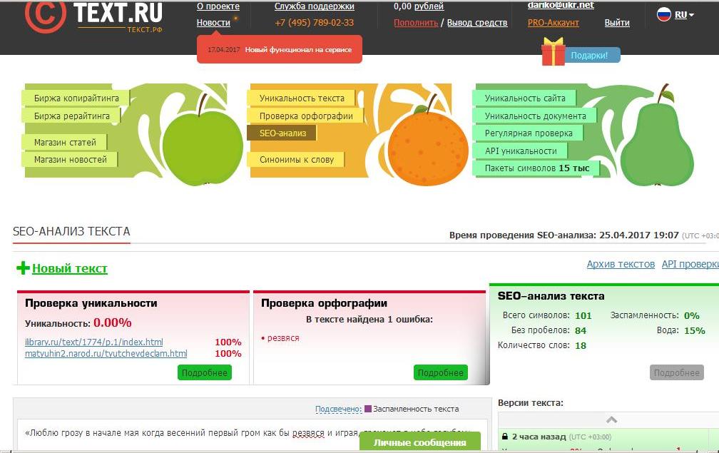 Бесплатный инструмент для определения уникальности, спамности, водности текста.