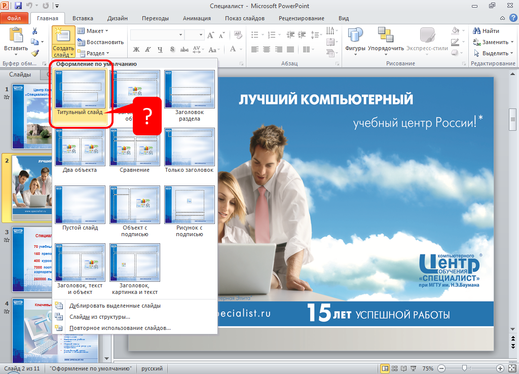 При создании презентации титульный слайд добавляется автоматически. Новый слайд можно добавить, используя макет предыдущего.