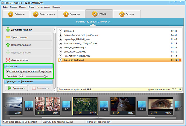 Позволяет добавлять различные типы музыкальных треков, такие как энергичные, спокойные, романтические и оптимистичные. Вы также можете добавить различные звуки, которые показывают эмоции, повседневную жизнь, видеоблог и действие. Вы можете добавить больше музыки и звука из магазина эффектов.