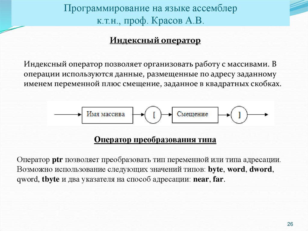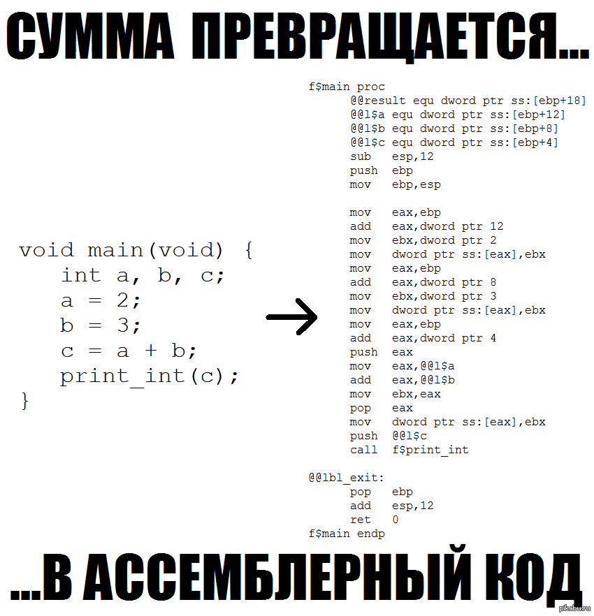 Стоит пояснить, что если к вопросу подойти формально строго, то команды процессора и команды ассемблера — это не одно и то же. Ассеммблер — хоть и низкоуровневый язык программирования, но иногда он без спроса программиста «корректирует код под себя». Причём у каждого ассемблера (masm, tasm, fasm) это может быть по-разному. Самый яркий пример — команда ret. В ассемблерном коде мы запишем ret, а реальный ассемблер ассемблирует её как retf или retn 8. Может также изменяться код, добавлением в качестве выравнивания кода команды процессора nop (об этом ниже в статье) и т.п. Чтобы не усложнять суть вопроса, под понятиями команды процессора и команды ассемблера мы будем подразумевать одно и то же.
