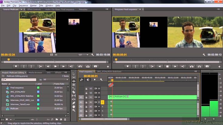 С Premiere Pro CC вы можете работать под разными углами одновременно. Например, вы можете редактировать аудиоклипы камеры А, используя камеру Б для предварительного просмотра видео.