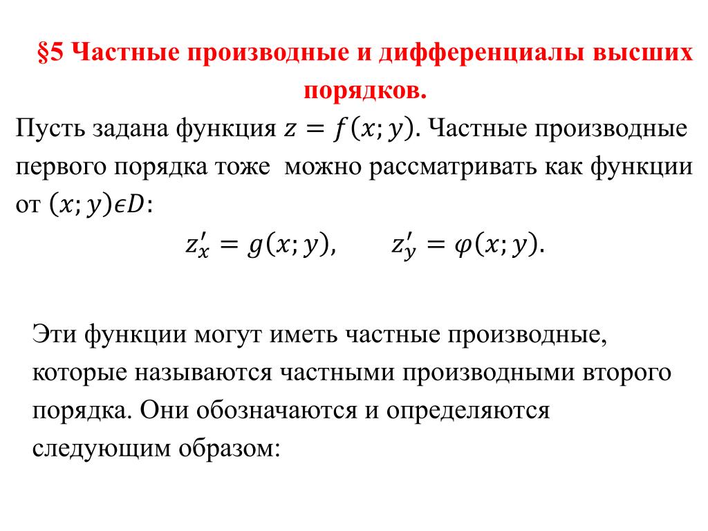В этом случае частные производные представляют собой функции двух переменных х и у, определенные в указанной окрестности точки М. Назовем их частными производными первого порядка. В свою очередь, частные производные по переменным х и у от функций в точке М, если они существуют, называются частными производными второго порядка от функции f (М) в этой точке и обозначаются следующими символами