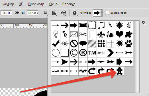 При активированном инструменте «Произвольная фигура» мы можем выбрать форму фигуры из палитры выбора, которая открывается по клику по соответствующему значку в Панели параметров: