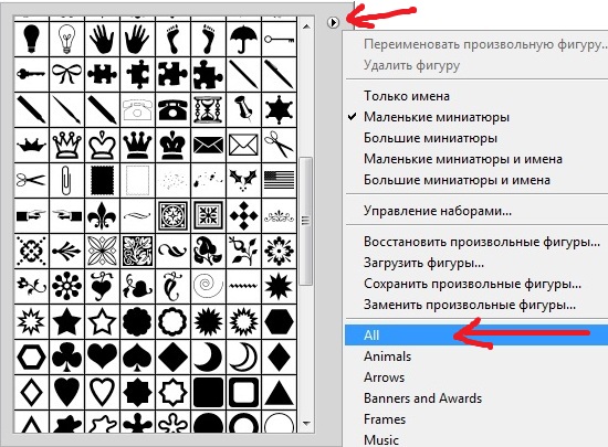 Как я уже упоминал, Photoshop поставляется с большим набором пользовательских форм. Чтобы их выбрать, нажмите на иконку палитры выбора в панели параметров, а затем на значок в правом верхнем формы выбора: