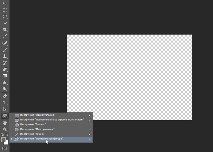 Открыв новый пустой документ Photoshop, выберите инструмент «Пользовательская фигура» в палитре «Инструменты». По умолчанию он скрыт за инструментом «Прямоугольник», поэтому нажмите на инструмент «Прямоугольник», затем удерживайте кнопку мыши нажатой в течение секунды или двух, пока не появится всплывающее меню, а затем выберите инструмент «Пользовательская фигура» из списка: