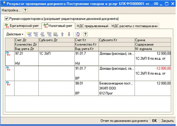 Эта операция проводится автоматически документом «Закрытие месяца», флаг «Списание убытков прошлых лет». Программа спишет с кредита счета 97.11 НУ в дебет счета 99.01 сумму убытков прошлых лет по соответствующей аналитике. Аналогичная проводка будет создана по виду учета ВР, но на отрицательную сумму.