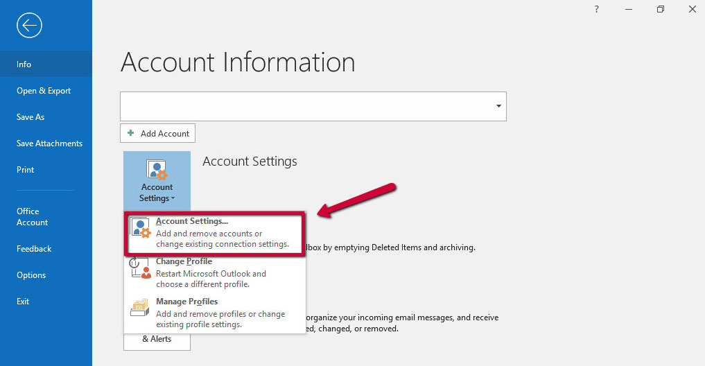 - Откройте почтовый клиент Outlook и пройдите в следующее меню: Файл – Настройки учетной записи – Настройки учетной записи;