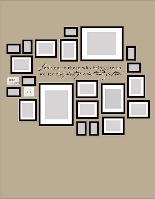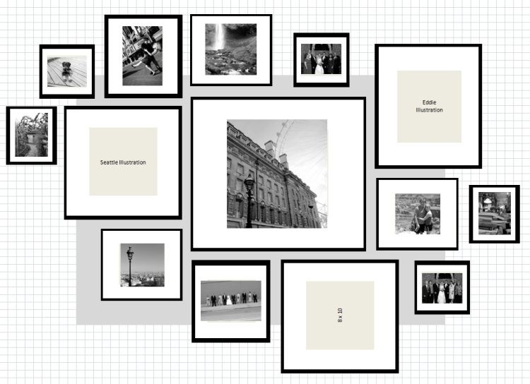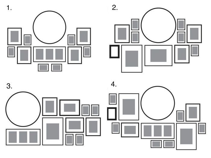 Придуманную схему расположения фото на стене нужно предварительно запечатлеть на бумаге. Так можно выбрать идею из созданных комбинаций.
