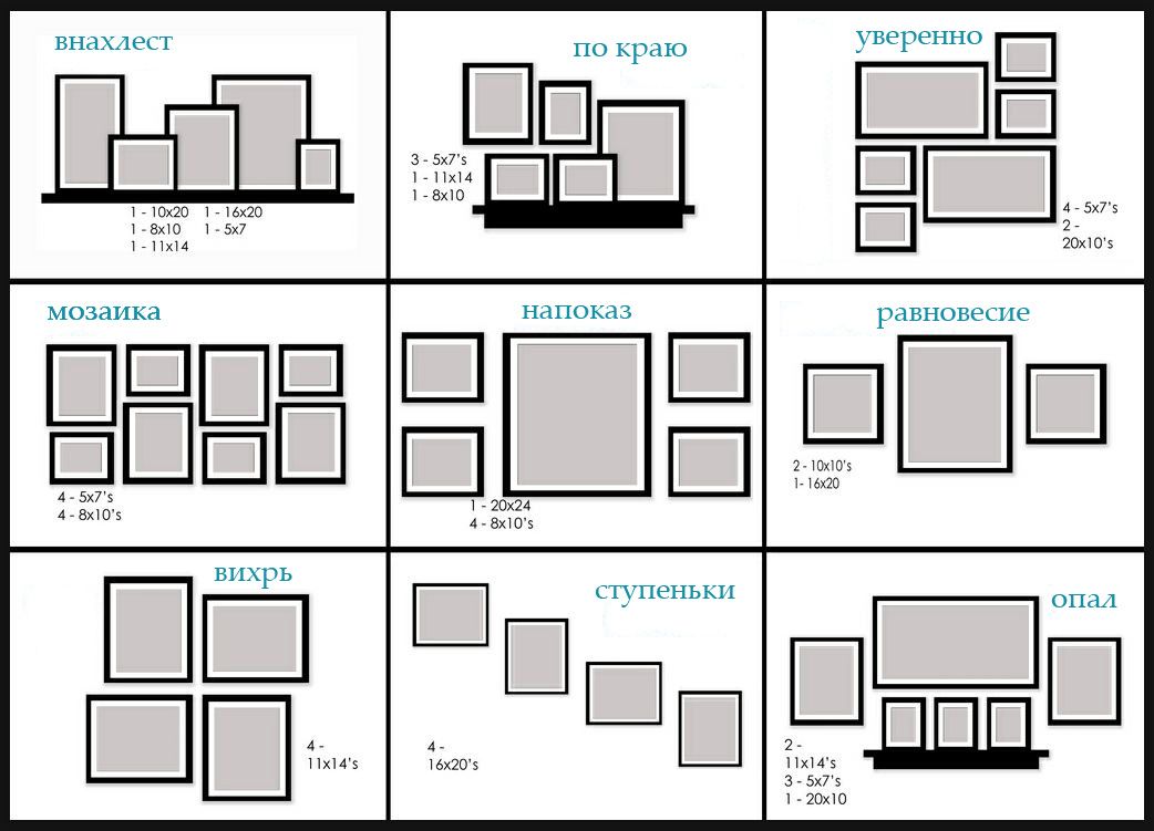 Все способы развешивания по типу оформления фотокарточек можно сгруппировать в 2 основных категории: