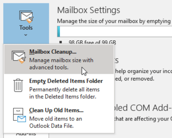 В Outlook выберите Файл> Инструменты > Очистка почтового ящика.