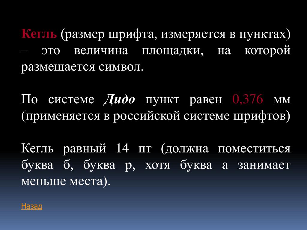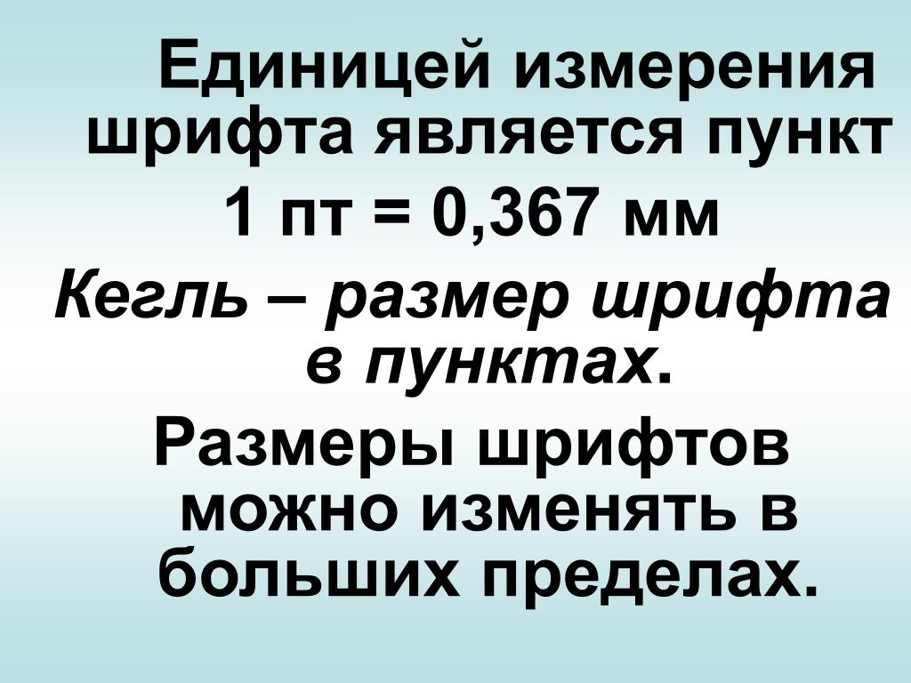 шрифта устанавливается в специальных единицах – пунктах. Один пункт (1