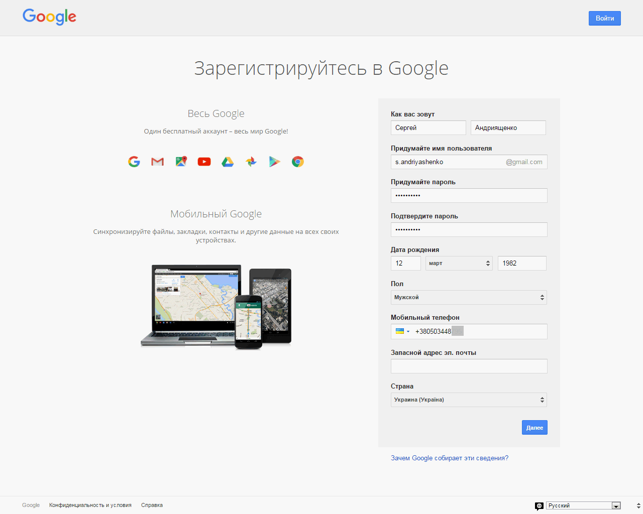 Переходим на следующую форму, здесь несколько полей: номер телефона, резервный email, день рождение и пол.