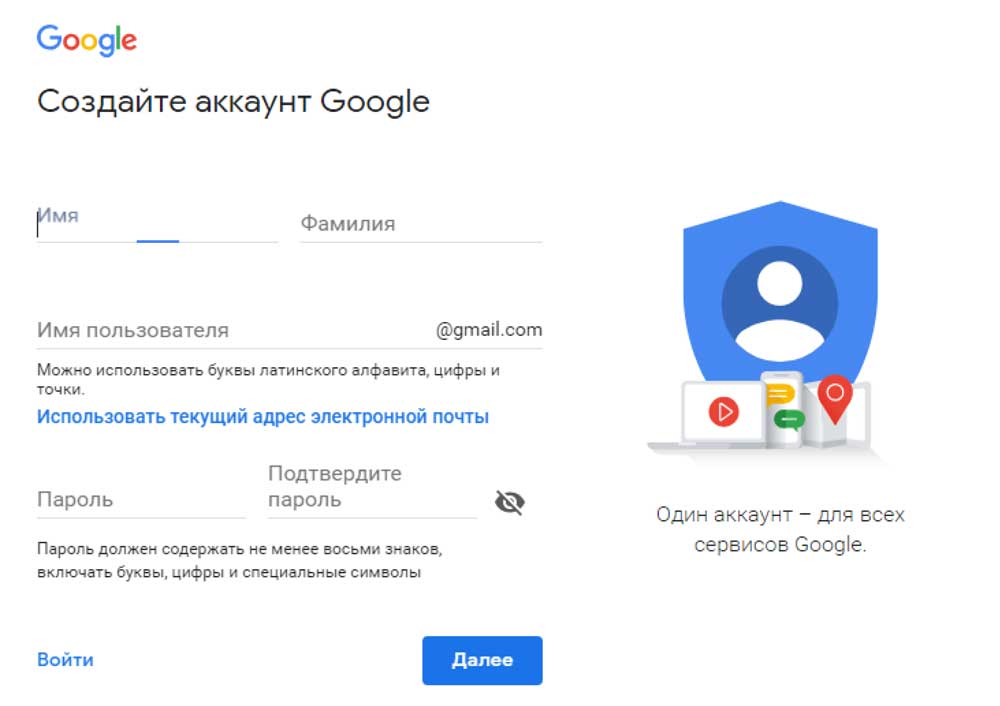 Последние два поля – это пароль и его подтверждение. Заполнив форму информацией, делаем щелчок “Далее”.
