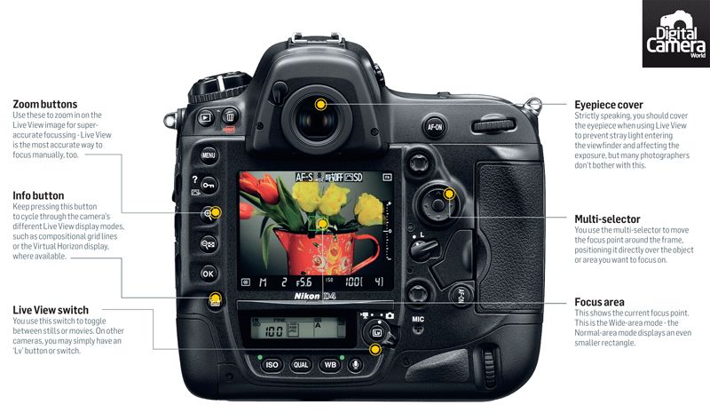 Поверните переключатель live view. Изображение, видимое через объектив, отобразится на мониторе фотокамеры.