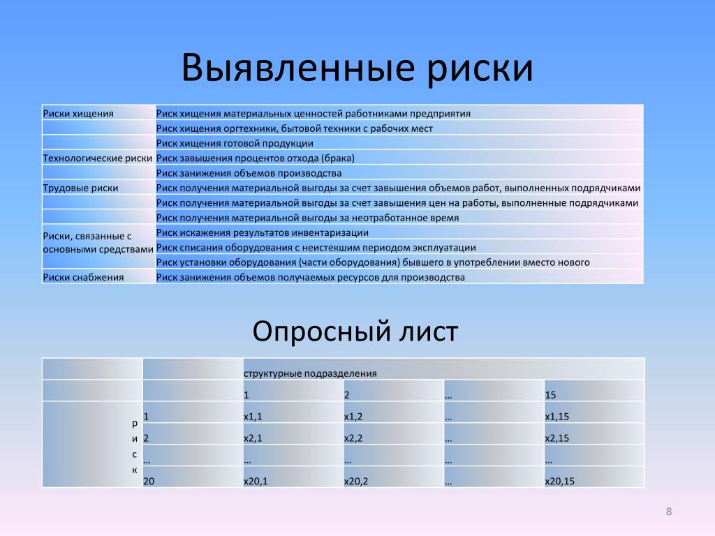 - Определите риск: Риски могут быть внутренними или внешними, поэтому включите любые события, которые могут вызвать проблемы или преимущества для компании.