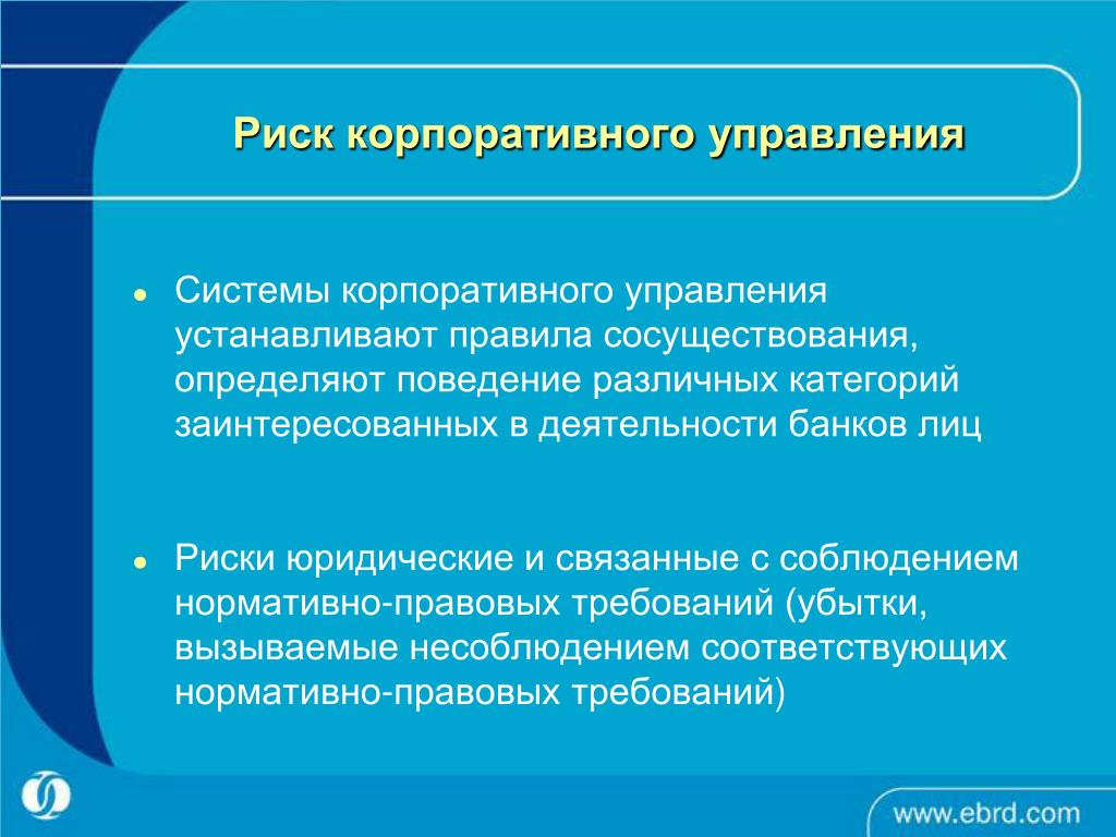 Указанный риск выражается в возможности наступления потерь из-за несоблюдения действующего законодательства или наличия в нем пробелов при осуществлении хозяйственной деятельности. То есть это риски возникновения ошибок при разработке внутренних нормативных актов, совершении сделок и других хозяйственных операций, которые приводят к ущербу, увеличению обязательств, обесцениванию активов компании.