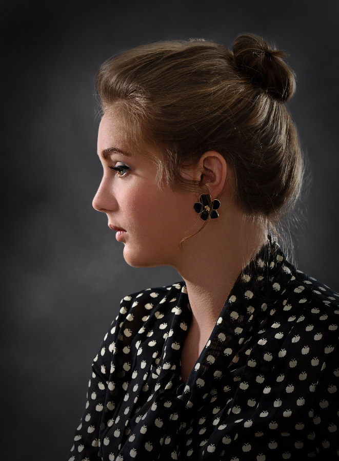 И опять — портретная тарелка, но уже под углом 45−50 гр. Свет локально, но мягко ложится на лицо модели, а светотеневой рисунок создается за счет поворота головы. Близкое расположение источника света сделает тени жестче и «провалит» задний фон, сделав его темным до черноты. Чем дальше будет расположен источник света в этой ситуации, тем больше будет световое пятно, мягче тени и светлее фон.