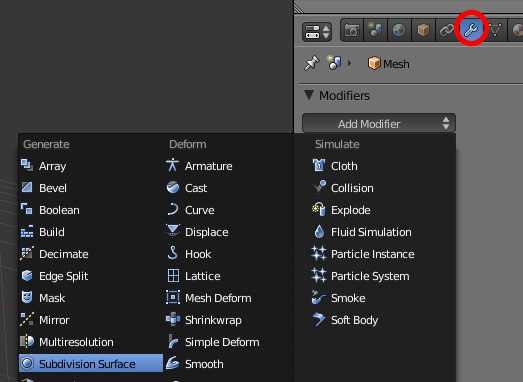 Модификаторы позволяют изменять характеристики вашей фигуры по определенным алгоритмах. Чтобы использовать модификаторы вернитесь в режим объекта, затем на правой панели выберите иконку со значком ключа: