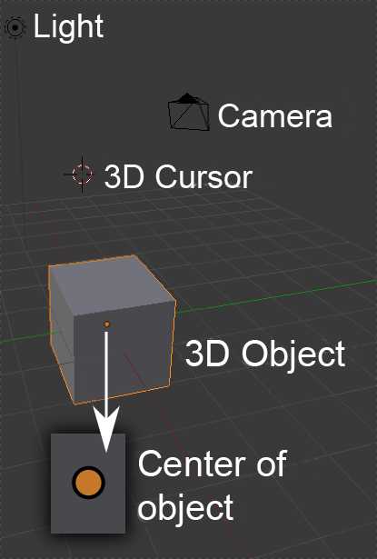 - Center Cursor: перемещает центр объекта в место расположения 3D-курсора (эта операция должна выполняться в Объектном Режиме, иначе Blender выдаст ошибку)