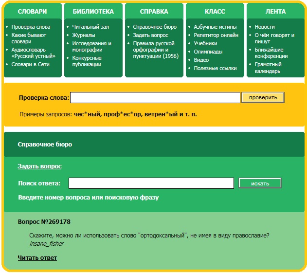 Открыв вкладку «Справка», ты попадешь на страницу с четырьмя разделами. В «Справочном бюро» ты можешь проверить, как пишется интересующее тебя слово. Во вкладке «Задать вопрос» пользователи портала имеют возможность обратиться с любым вопросом к сотрудникам сайта, указав свою электронную почту.