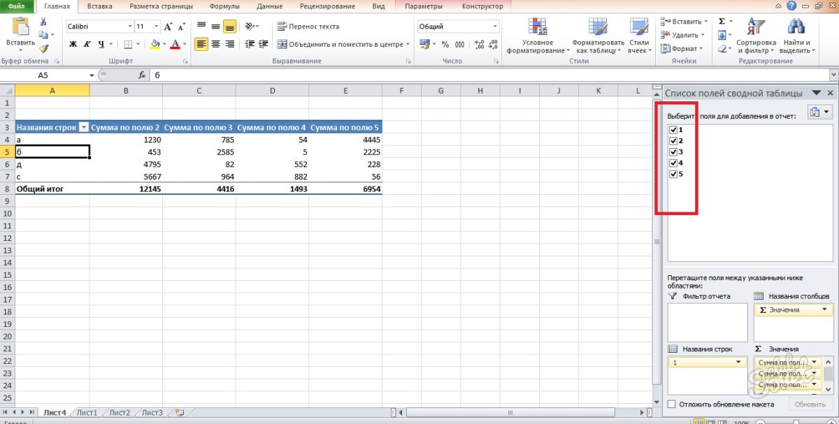 В верхней части области «Имя поля» установите флажок для любого поля, которое вы хотите добавить в сводную таблицу. По умолчанию нечисловые поля добавляются в область строк, поля даты и времени добавляются в область «Столбец», а числовые поля — в область значений. Вы также можете вручную перетащить любой доступный элемент в любое из полей сводной таблицы или, если элемент в сводной таблице больше не нужен, просто перетащите его из списка полей или снимите его.