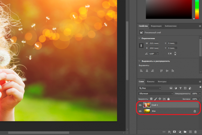 Если размеры не совпадают, с помощью настройки «Свободное трансформирование» в меню «Редактирование» подгоните фото, которое вы поместили сверху, под размер нижнего слоя.