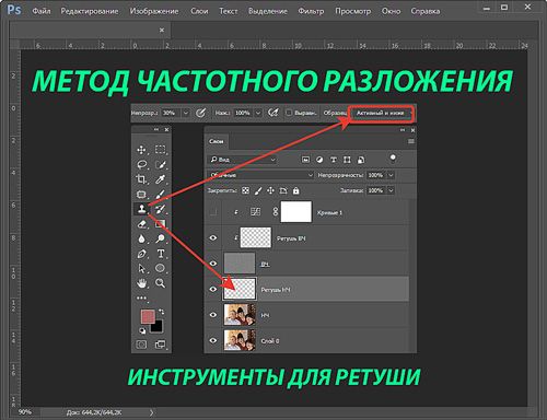 Средние частоты в вышеописанном методе слились с высокими и редактировались самостоятельно, потому метод частотного разложения на три слоя куда правильнее и качественнее. Рассмотрим его.