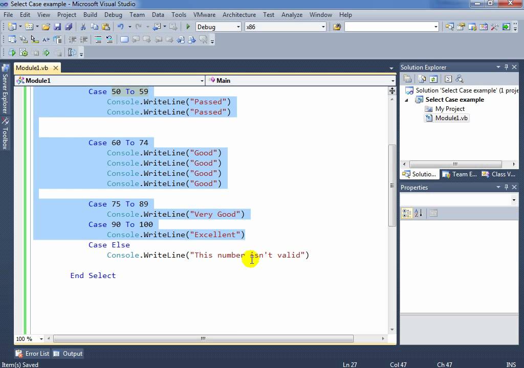 Можно использовать несколько выражений или пределов в каждом условии Case. Например, Case 1 TO 4, 7 TO 9, 11, 13, Is > n %.
