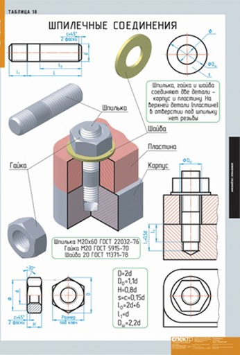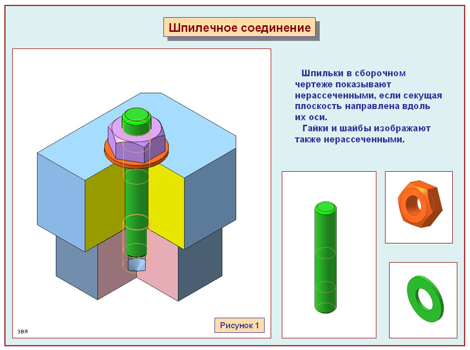 Не показывают зазоры между деталями и фаски на гайке и стержне шпильки. На видах, полученных проецированием на плоскость, перпендикулярную оси резьбы, не изображается резьба и шайба. Крепежные детали в разрезах оставляют нерассеченными. В