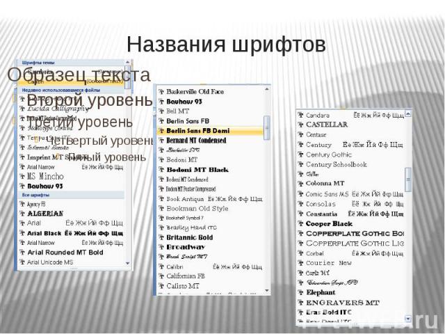 Шрифты бывают с засечками, то есть с хвостиками, прикрепленными к каждой букве. Times New Roman является примером шрифта с засечками. Эти типы шрифтов облегчают чтение большого объема текста на слайдах (но, по возможности, делая презентацию, надо избегать больших объемов).