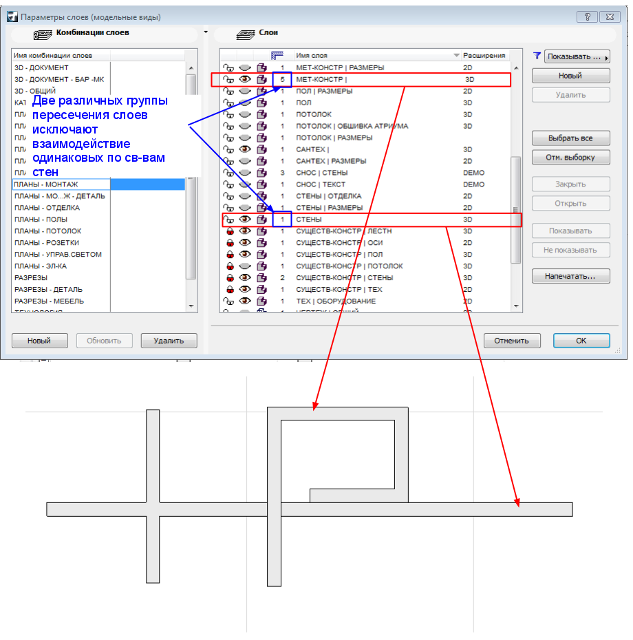 Стены с разными приоритетами пересечения слоев не пересекаются в плане.