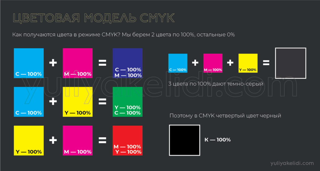 Смешивая три краски — 50% циана, 50% мадженты и 50% жёлтого со 100% черного можно добиться на печати наиболее глубокого, наиболее приятного чёрного цвета.
