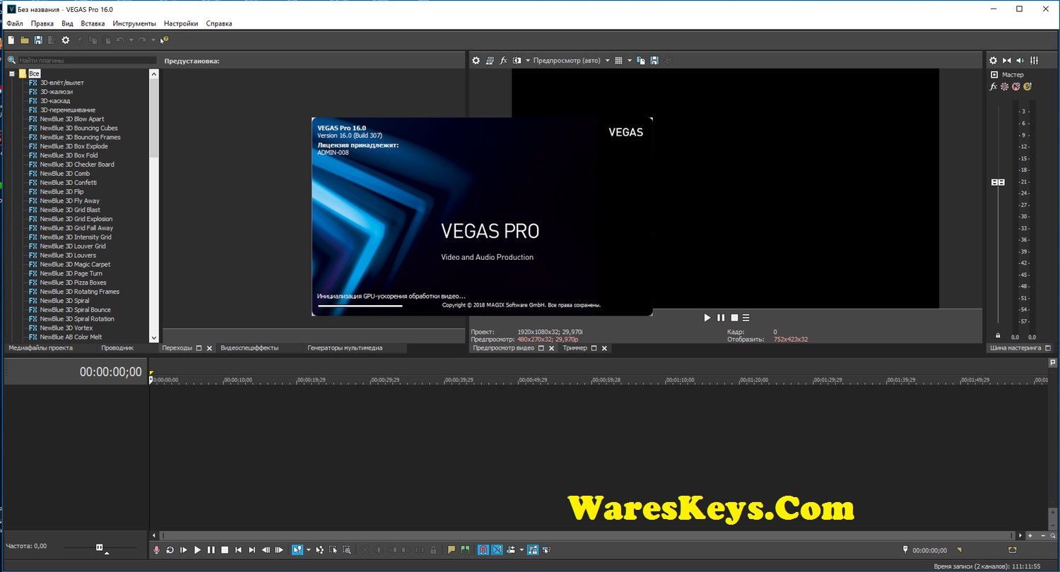 Окно Sony Vegas Pro — то, где Вы редактируете свой проект, и экран разделен на несколько областей.