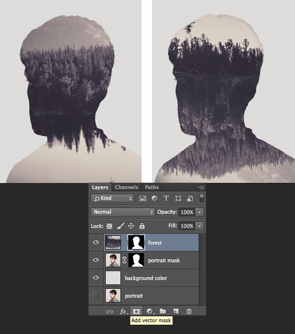 Обязательно попробуйте разные режимы микширования и посмотрите, какой из них дает желаемый результат. На этом изображении я использовал режим Screen Merge, а также маску слоя для достижения этого эффекта.