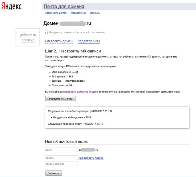 Если вы увидите сообщение о том, что нет MX-записи, проверьте, есть ли в ресурсных записях домена запись mx.yandex.net. с приоритетом 10.