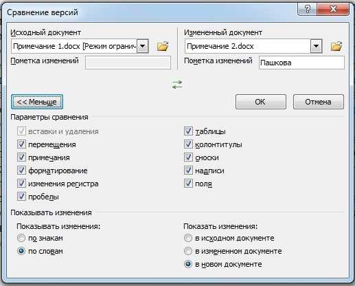 6. Нажмите “Больше”, а затем задайте требуемые параметры для сравнения двух документов. В поле “Показывать изменения” укажите, на каком уровне они должны отображаться — на уровне слов или знаков.