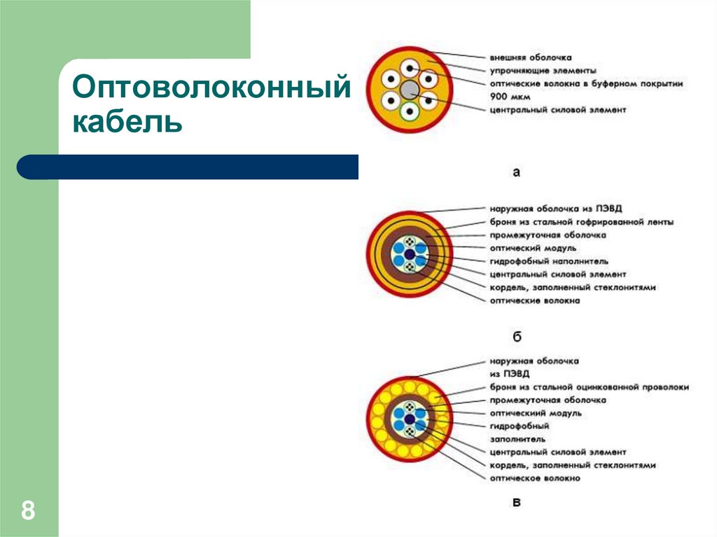 Внутренний оптоволоконный кабель обычно включает в себя герметичный буферный кабель, распределительный кабель, разрывной кабель, бронированный кабель и т. Д.Задача кабеля — защитить волокна от окружающей среды, с которой сталкивается установка