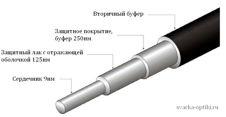 Строение достаточно простое в центре находится само ядро. Обычно ядро делается из кварцевого, стеклянного или полимерного волокна. Далее идёт оболочка и защитное покрытие.