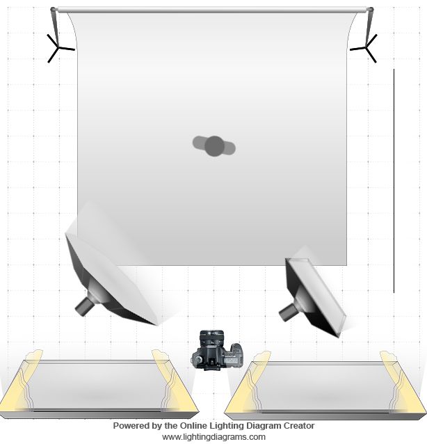 - Более сложный вариант схемы студийной съемки – два источника расположены по бокам объектива на 70 градусов.