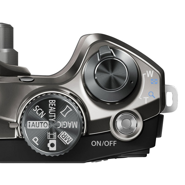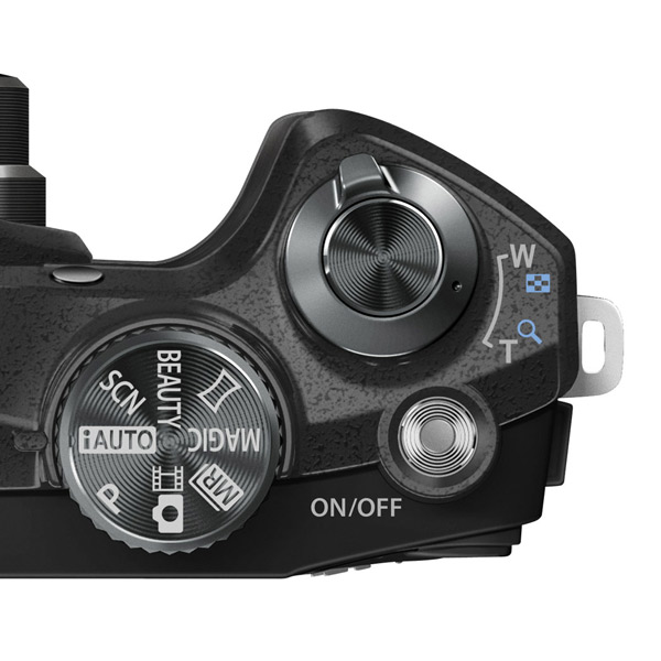 Компания Olympus изменила расположение кнопок по сравнению с SZ-30, но это не изменилось к лучшему. Сверху кнопка питания оказалась в еще менее удобном месте и теперь находится в углублении в рамке, что требует небольшого дополнительного усилия для включения или выключения камеры. Диск режимов меньше полноразмерного, но имеет слабое сопротивление и легко вращается в сумке или кармане.
